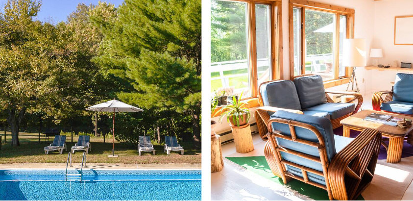 If you’re looking for something with small-town vibes and a bit more seclusion (and mountain views), check out Hudson Hill House in the heart of the Hudson Valley. Set on four private acres with treetops and mountain views, this luxurious home has its very own swimming pool where you can swim and sunbathe in privacy.